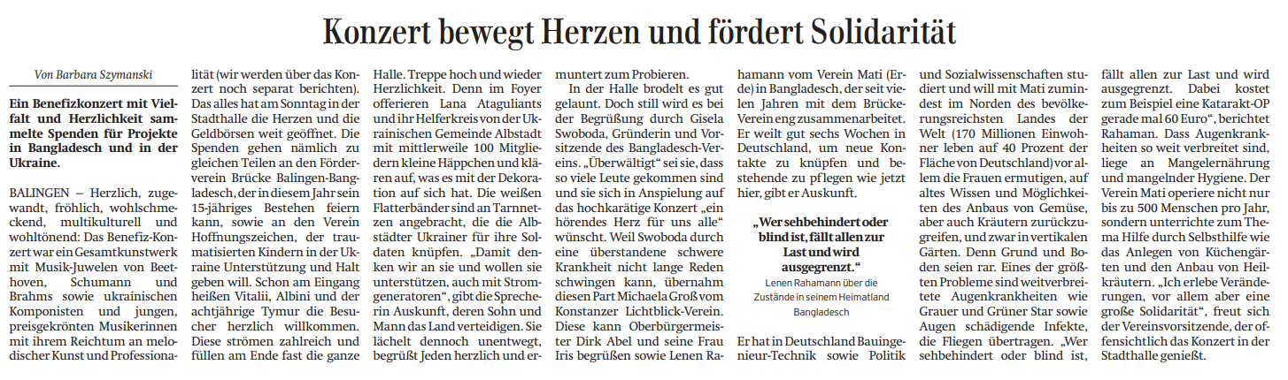 Die Resonanz war überwältigend: Das Publikum bedankte sich mit langanhaltendem Applaus und einer beachtlichen Spendenbereitschaft. Jeder Euro des Abends fließt direkt in die Projektarbeit, um Menschen in Bangladesch eine bessere Perspektive zu ermöglichen und zur Hilfe für die traumatisierten Kinder in der Ukraine.
